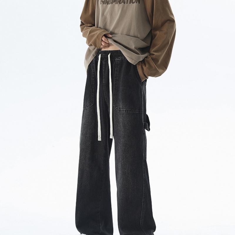 Брюки рабочего кроя с эластичной талией и накладным карманом для мужского осенне-зимнего сезона, новые универсальные джинсы прямого широкого кроя 3XL чёрный