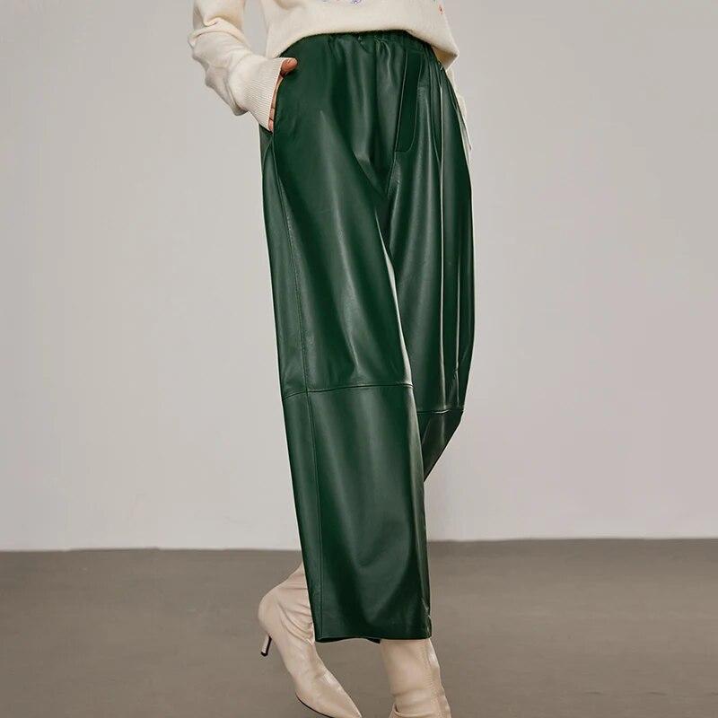 Брюки-шаровары из натуральной кожи, женские уличные брюки с высокой эластичной резинкой на талии, капри из 100% овчины, кожаные брюки, уличная одежда M зелёный