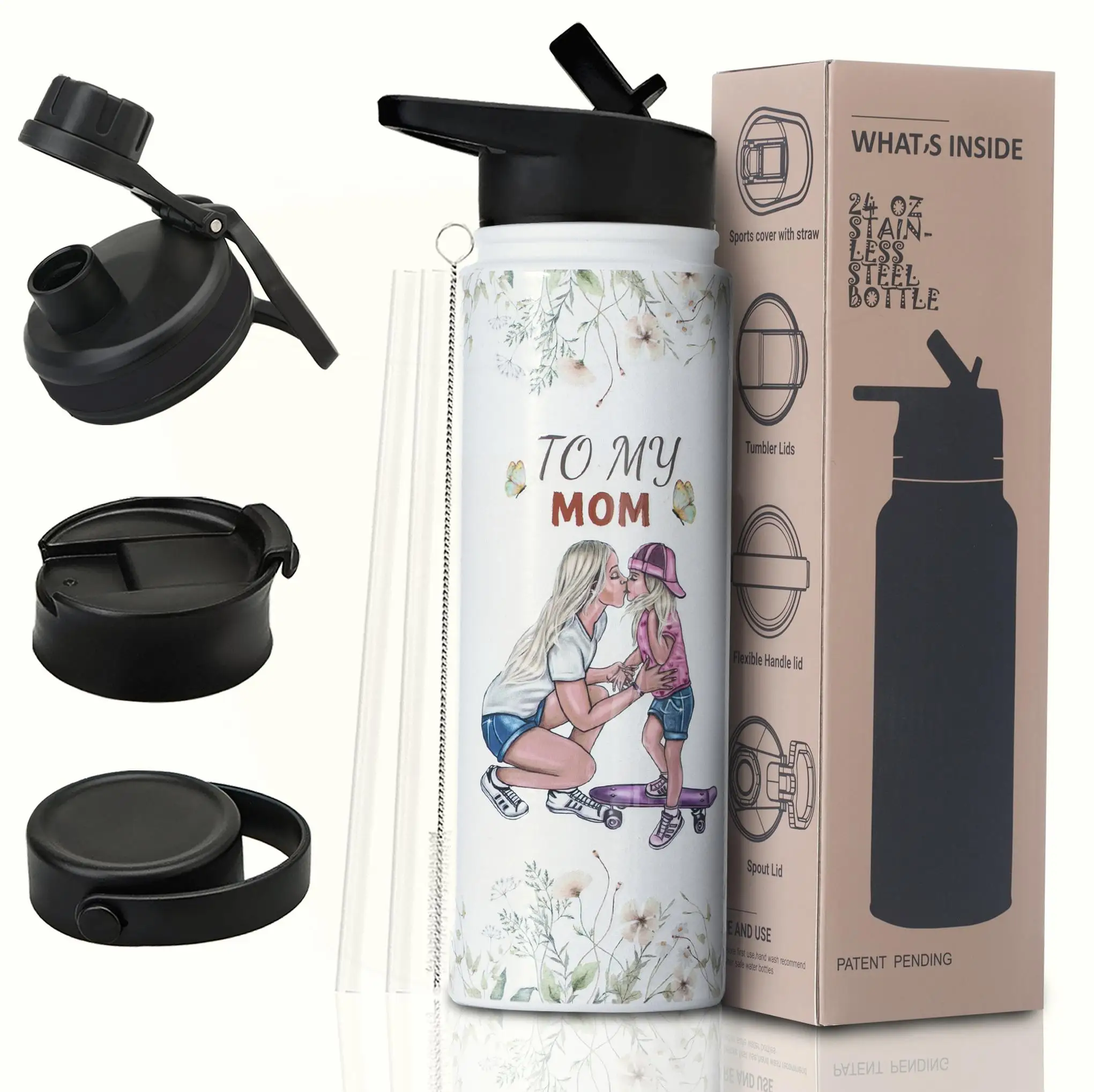 Бутылка для воды из нержавеющей стали на 24 унции для мамы — вакуумная изоляция, двойные стенки, соломенная крышка, 3D-печать, готовый к подарку