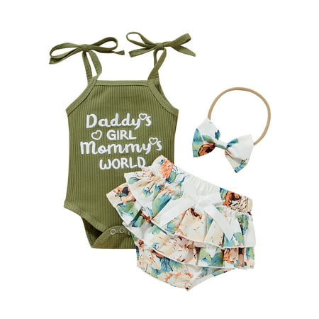 Nokpsedcb Infants Baby Girls 3Pcs Summer Outfits Sleeveless Self-Tie Strap Rib Knit Romper Bloomer Shorts Headband Set Green 6-9 Months