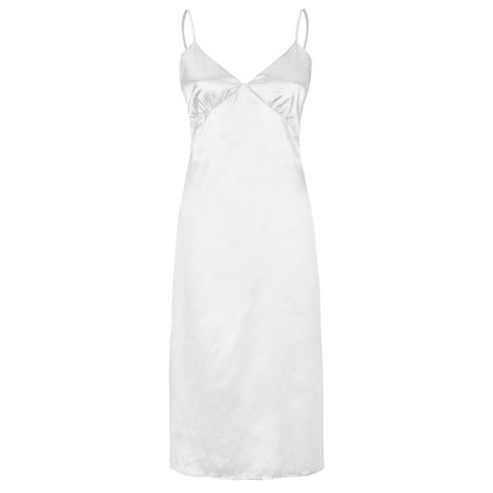 Women Summer Spaghetti Strap Silky Long Dress Sexy V-Neck Solid Color Nightgown