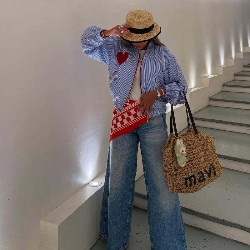 2025 Autumn Baseball Jacket Fashion Long Sleeve Loose Coat Vintage Stripe Women Jacket Casual Office Outerwear