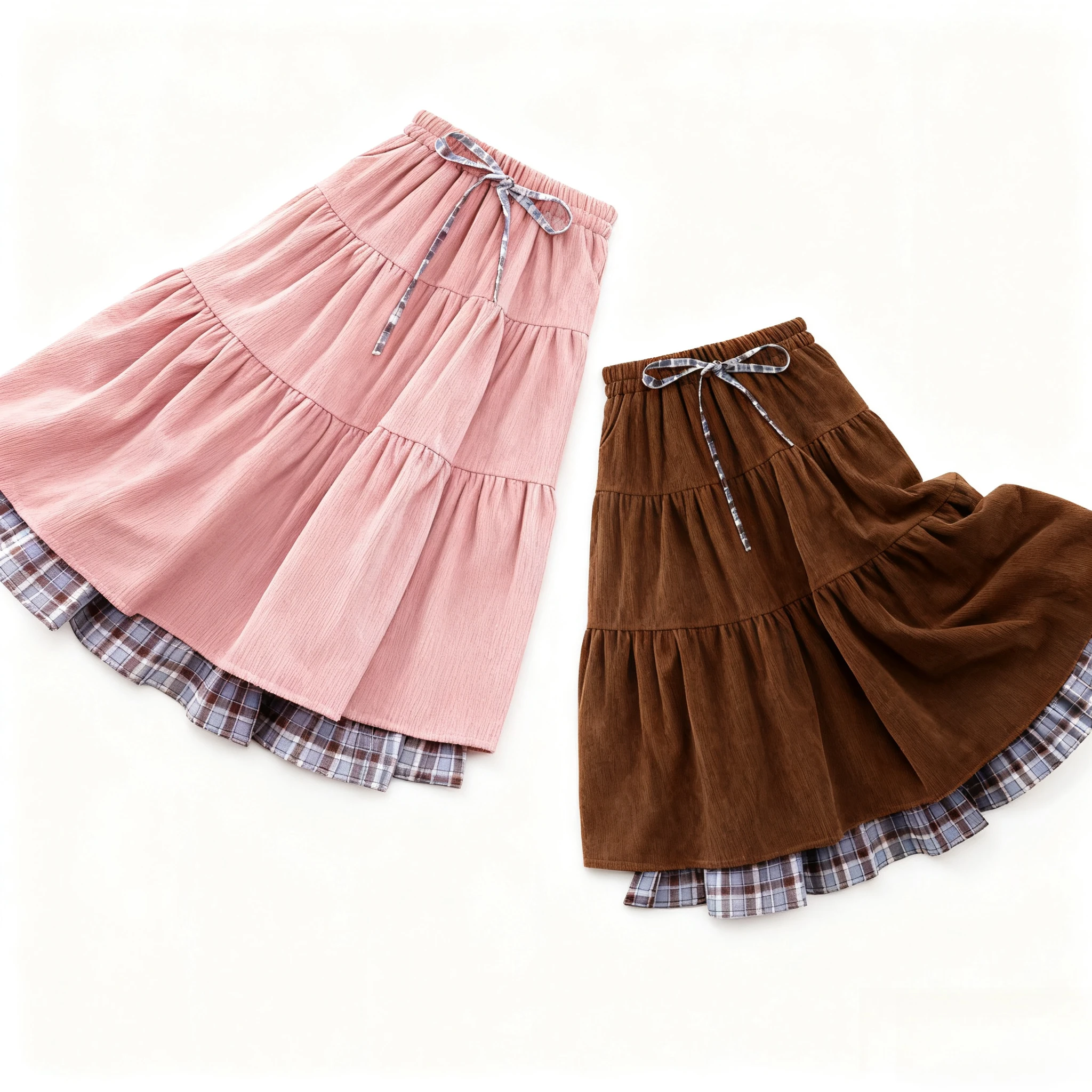 Вельветовая клетчатая юбка для девочек-подростков, модная лоскутная юбка из 2 предметов, осень-зима, розовая длинная юбка принцессы с рюшами в корейском стиле для детей