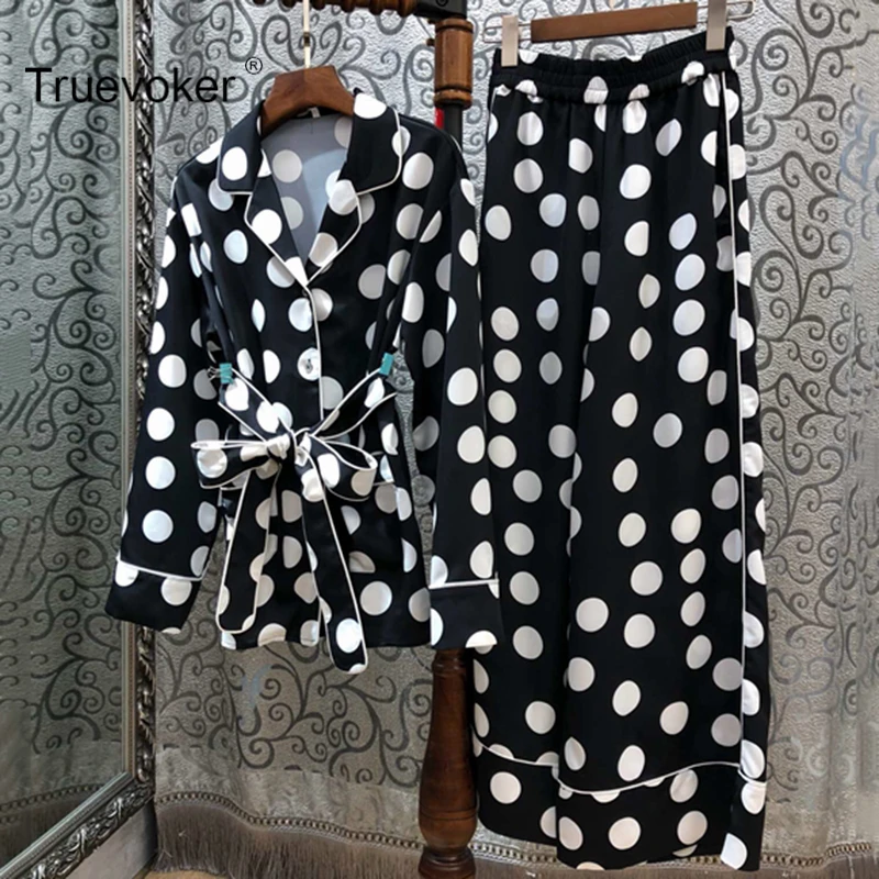Truevoker Spring Designer Suit Set Women's Full Sleeve Polka Dot Printed Tied Waist Blouse With Long Pants Casual Pajamas