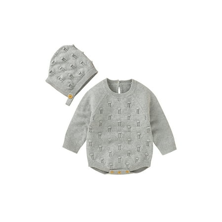 Sunisery 2Pcs Newborn Baby Girls Boys Knit Romper Solid Long Sleeve Warm Jumpsuit Hat Autumn Winter Clothes Light Gray 18-24 Months