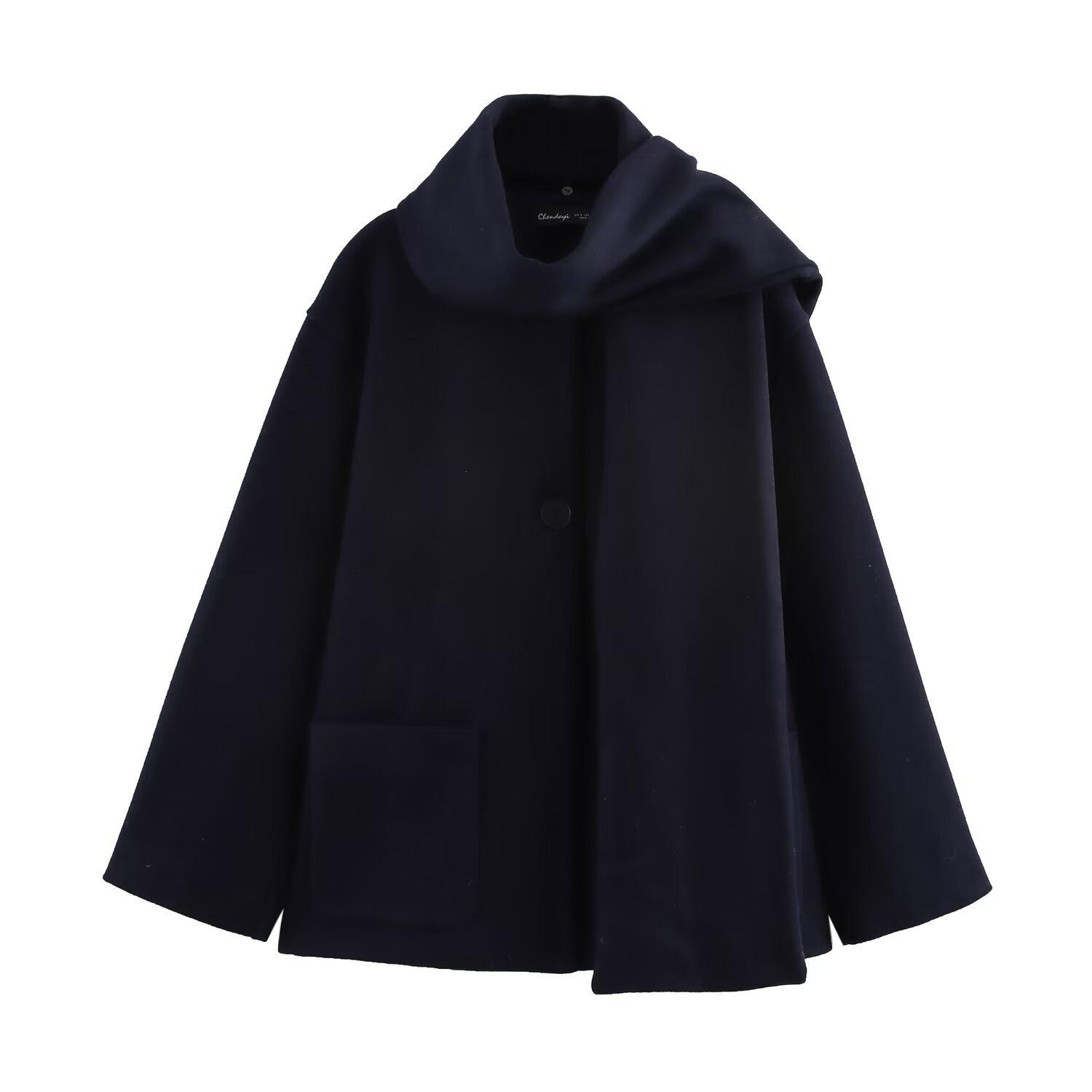 Весеннее женское свободное шерстяное пальто 2025 года с шарфом в качестве декора - Теплое и универсальное Extra Small темно-синий