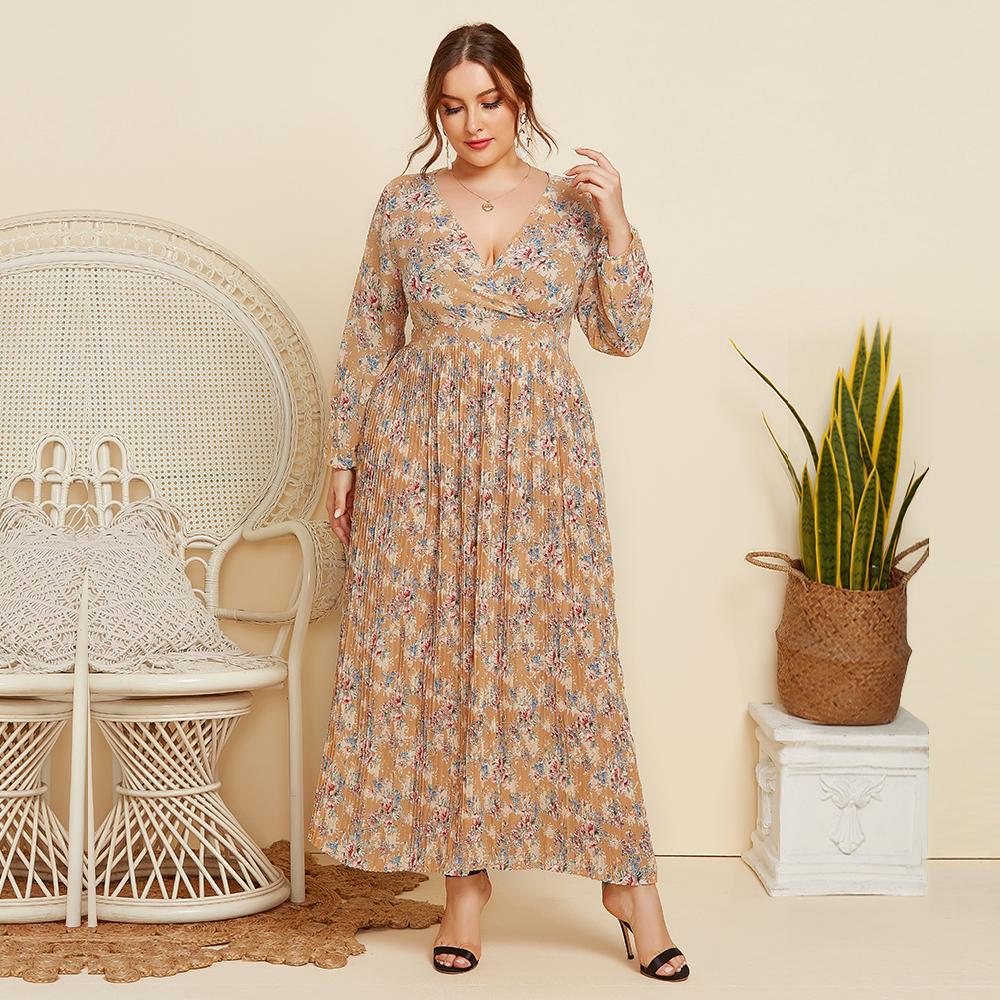 Весенне-летнее женское платье больших размеров с глубоким V-образным вырезом и пышными рукавами, темпераментное платье с длинными рукавами и цветочным принтом, XL-4XL