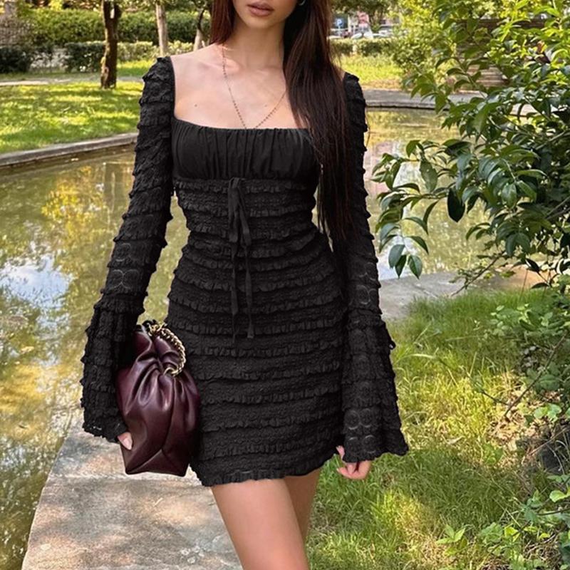 Весенне-летнее женское сексуальное платье 2024, новое кружевное короткое платье с расклешенными рукавами и квадратным вырезом, облегающее вечернее платье трапециевидной формы на шнуровке 5276A-40 L чёрный