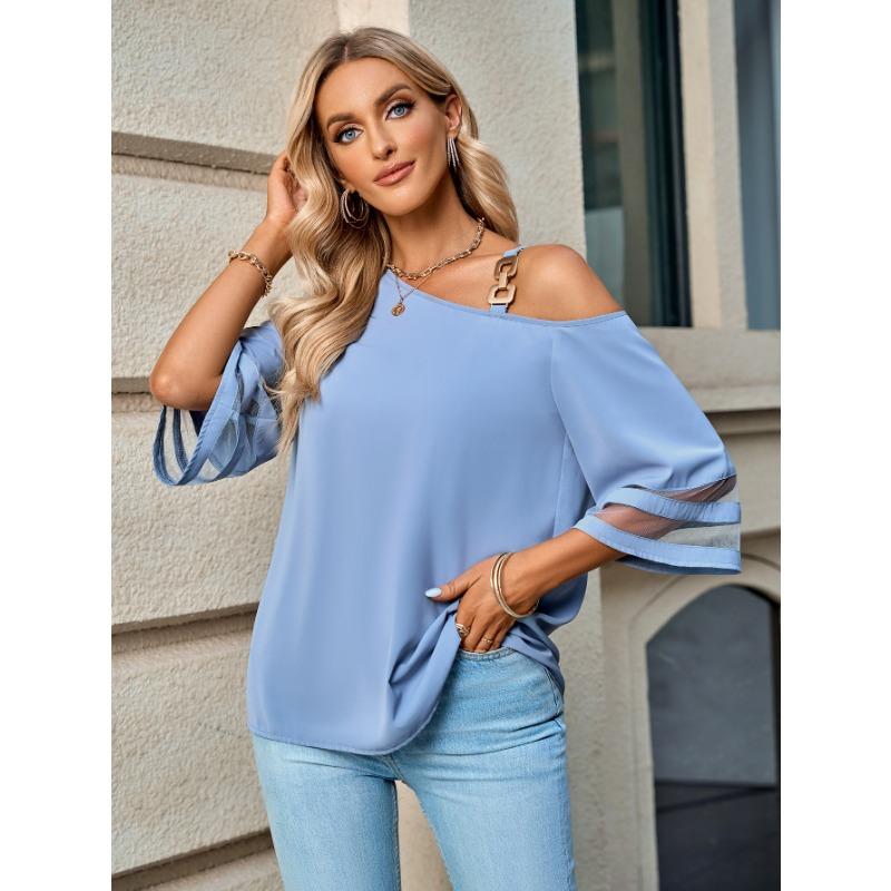 Весенне-летние блузки Женская рубашка с косым вырезом и свободными рукавами пять четвертей Модная повседневная однотонная майка на одно плечо с металлической пряжкой Женская S сине серый