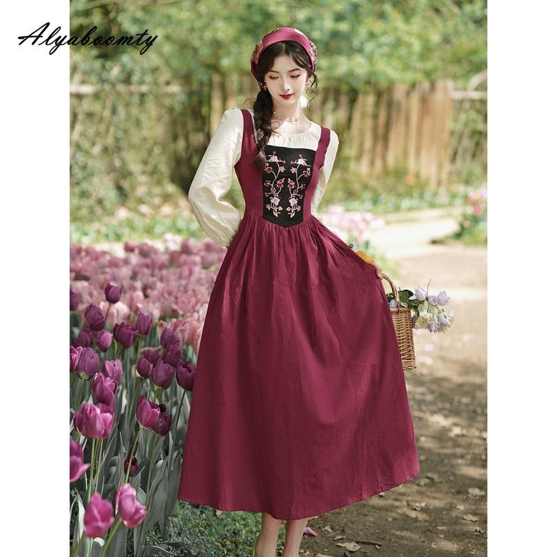 Весенне-осеннее миди-платье в стиле коттеджкор, пэчворк, контрастная вышивка, винтажное платье, элегантное длинное платье из хлопка и льна с шарфом S