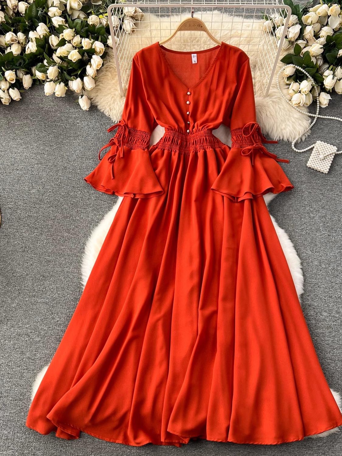 Весенне-осеннее новое длинное платье ярких цветов Fahison, женское элегантное платье с v-образным вырезом и расклешенными рукавами, с высокой талией, праздничные пляжные платья макси-халат One Size оранжевый
