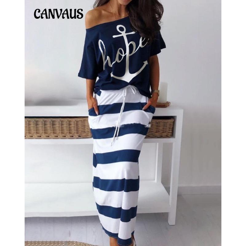 Весенне-осенняя женская футболка с принтом в полоску, костюм с юбкой до половины тела