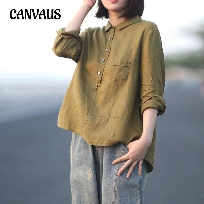 Весенне-осенняя повседневная свободная однотонная рубашка в стиле ретро в стиле ретро, женская хлопково-льняная рубашка с длинными рукавами с лацканами, рубашка больших размеров