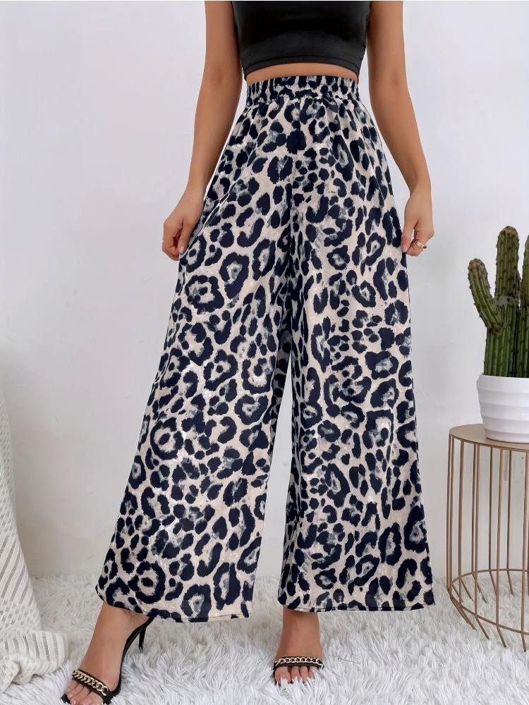 Весенняя женская мода Классический леопардовый принт Эластичная талия Драпированные Свободные Повседневные Широкие брюки XXL серый