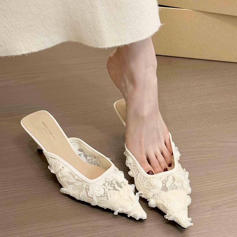 Весна Лето Женские Мюли-Шлепанцы с Острым Носком Мода Высокий Каблук Вечеринка Платье Дамские Цветы Слайды Обувь 35 абрикосовый
