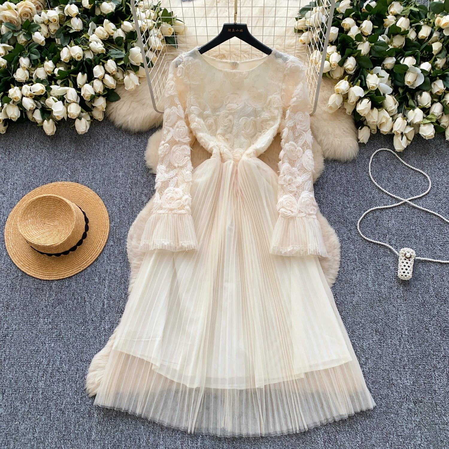 Весна Лето Женские Элегантные 3D Цветочные Расклешенные Рукава Принцесса Вечерние Сетчатые Плиссированные Платья L абрикосовый