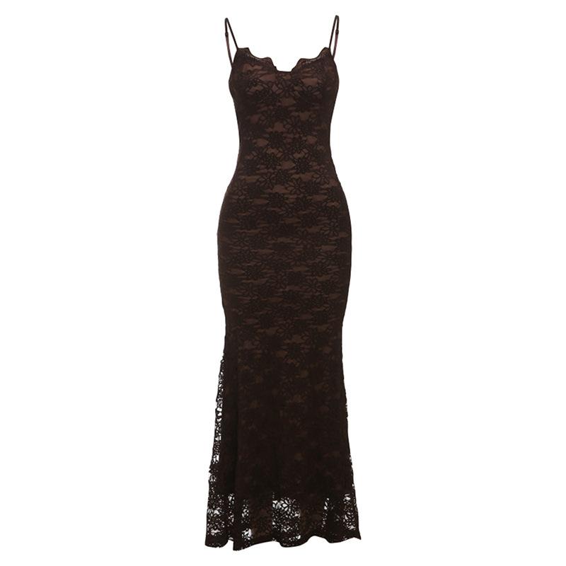 Весна Новое Женское Французское Ретро Темперамент V-образный вырез Кружево Открытая спина Полый Платье на бретелях L темно-коричневого