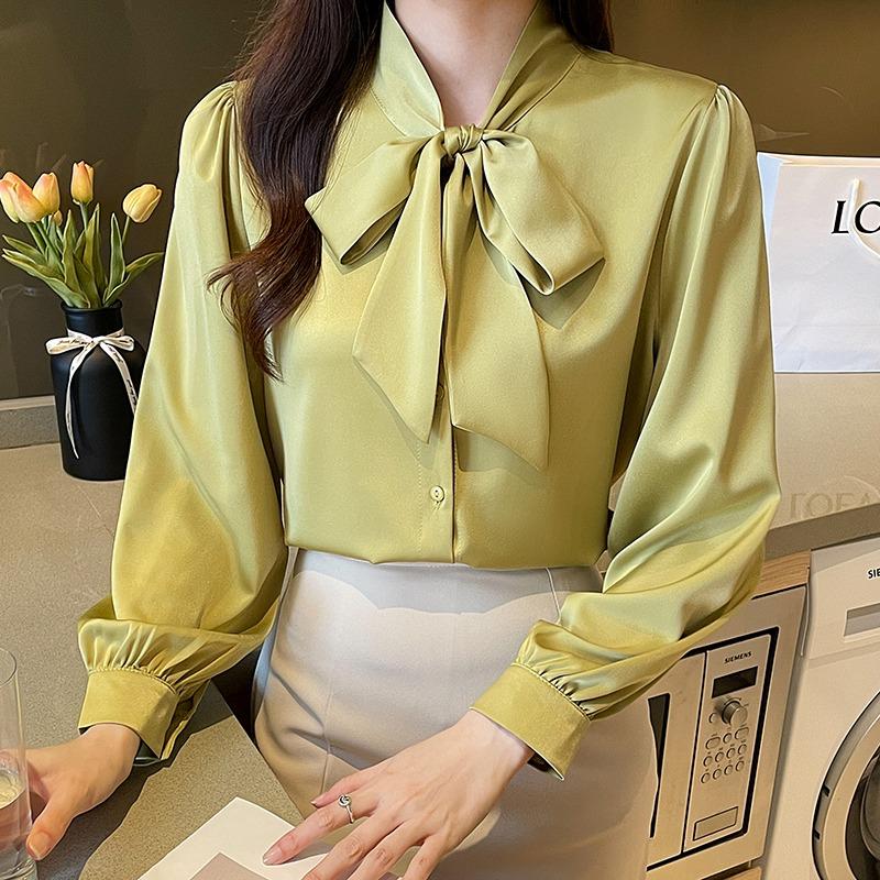 Весна Осень Длинные рукава Женская шифоновая рубашка Корейский стиль Свободный галстук-бабочка Воротник Свободная Простая блузка Женская мода Элегантный Повседневный Простые топы 3604 One Size жёлтый