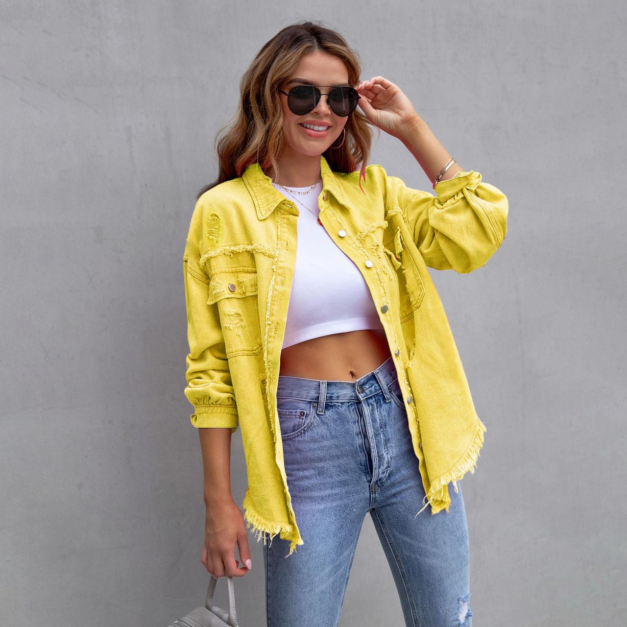 Весна Осень Женская Джинсовая Куртка С Необработанными Краями Женская Рубашка Стиль Повседневный Верхняя Одежда Женское Пальто XS жёлтый