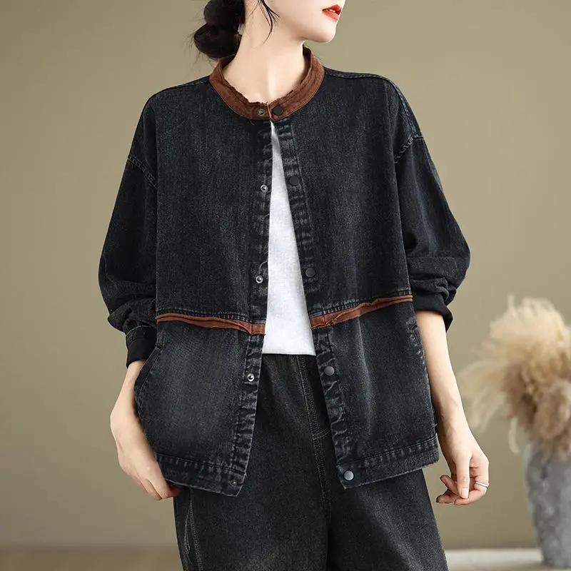 Весна Осень Женская Круглая Горловина Свободная Удобная Ретро Повседневная Плюс Размер Джинсовая Куртка Для Женщин S чёрный