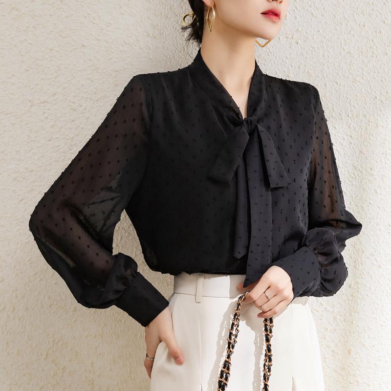 Весна-Осень Женская рубашка с бантом в горошек, модная свободная блузка с длинным рукавом, женская повседневная простая элегантная однотонная одежда 2842 XL чёрный