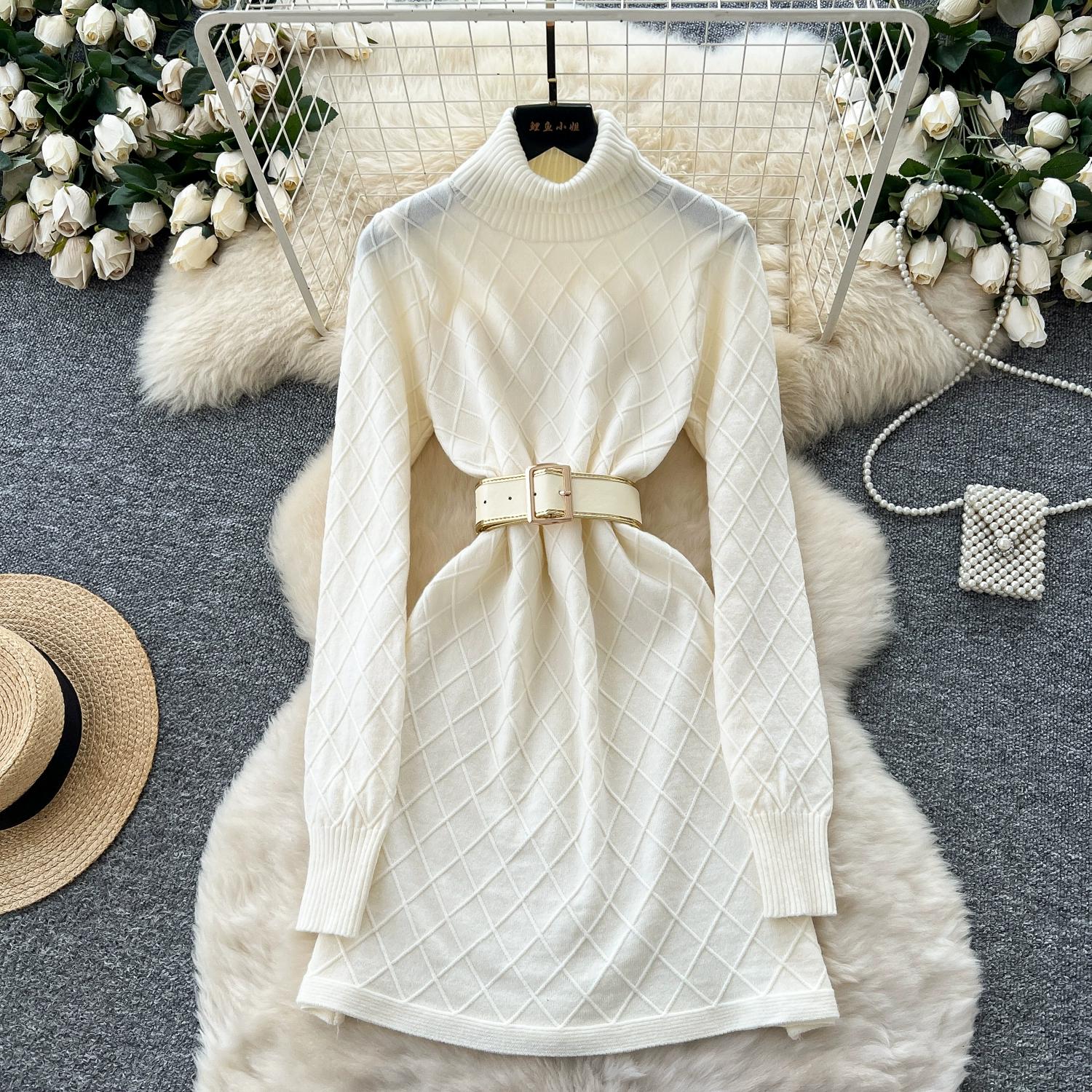 Весна Осень Женский Свитер с Полным Рукавом и Воротником Гольф в Клетку, Мини Короткие Платья-Футляры с Поясом One Size абрикосовый