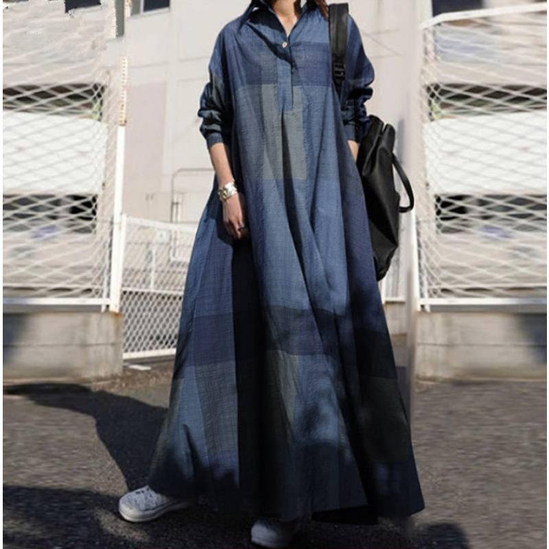 Весна Осень Женское Платье Большого Размера Модное Винтажное Платье с Принтом Платье с Длинным Рукавом Свободного Кроя Платья с Широкой Юбкой XXXXXL синий