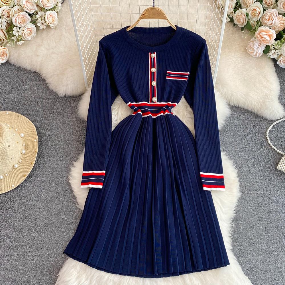 Весна Осень Женщины O-образный вырез Трикотажное плиссированное платье Женщины Полный рукав Мини Короткий вязание Свитер Платья