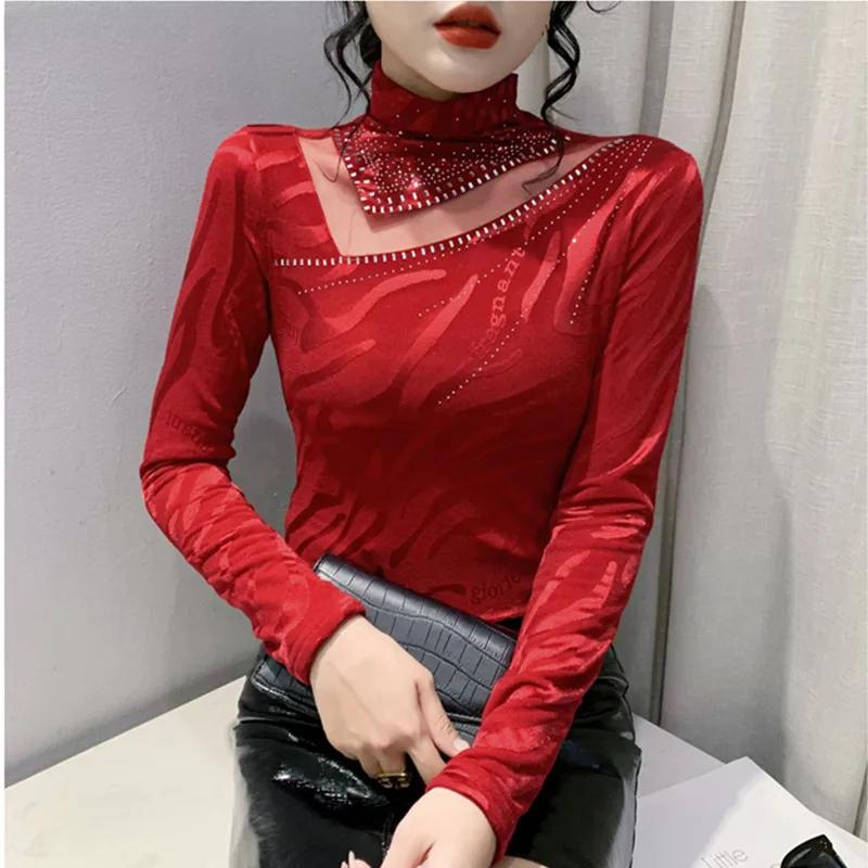 Весна Осень Классическая Женская Футболка с Водолазкой и Длинными Рукавами Модная Сексуальная Футболка с Горячими Бриллиантами Эластичная Приталенная Девичья Топы Блузка XL красный