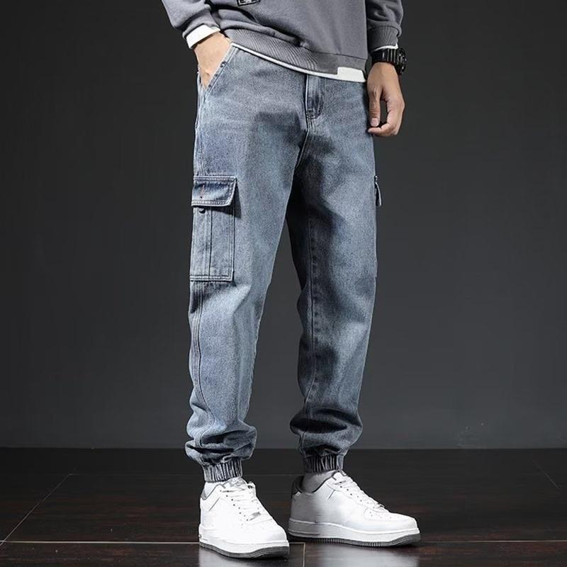 Весна Осень Мужские джинсы Многокарманная рабочая одежда Брюки-карго Черные Синие Джинсы с Эластичным Поясом Джинсовые Джоггеры Большие Размеры Джинсовые Брюки S синий