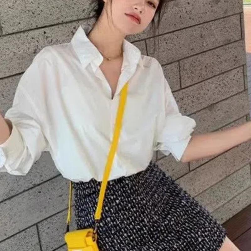 Весна Осень Новая Мода Отложной Воротник Длинный Рукав Однотонные Блузки Женские На Пуговицах Французский Стиль На Все Случаи Жизни Рубашки XL белый