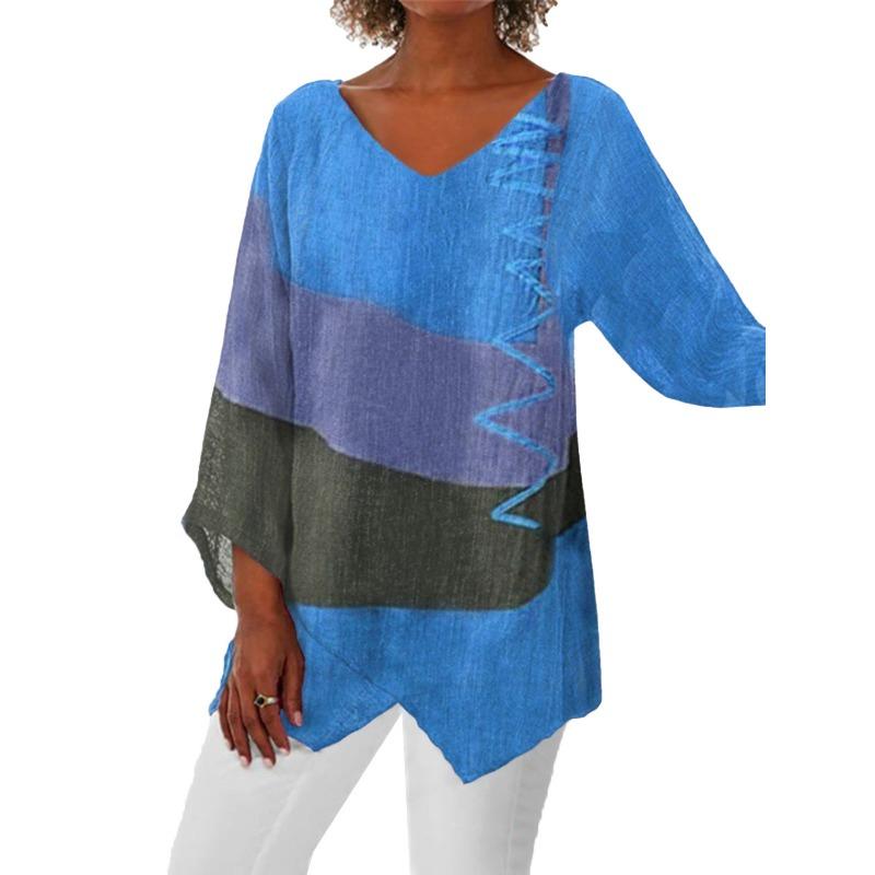 Весна Осень Повседневная Свободная Блузка с V-образным вырезом и неровным подолом с художественным принтом Женская Новая Элегантная Большого размера Ретро Длинный Топ Простая Офисная Уличная Одежда Базовая Рубашка 5XL