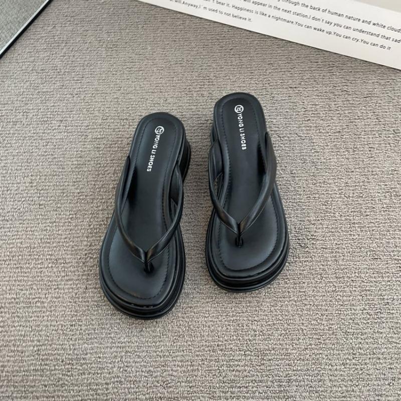 Весна новая модная универсальная обувь на толстой подошве, шлепанцы маффины, женская обувь для улицы, пляжа, с зажимом для пальцев 35 чёрный