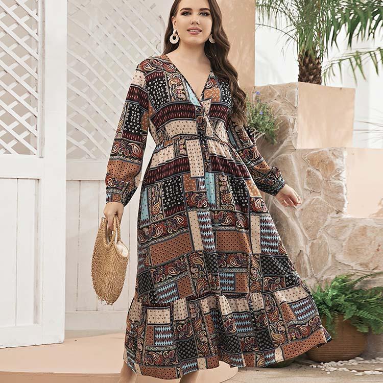 Весна и осень Темперамент Принт Женское Платье Плюс Размер Темперамент Пригородный Модное Платье Цветные Блоки 0XL хаки