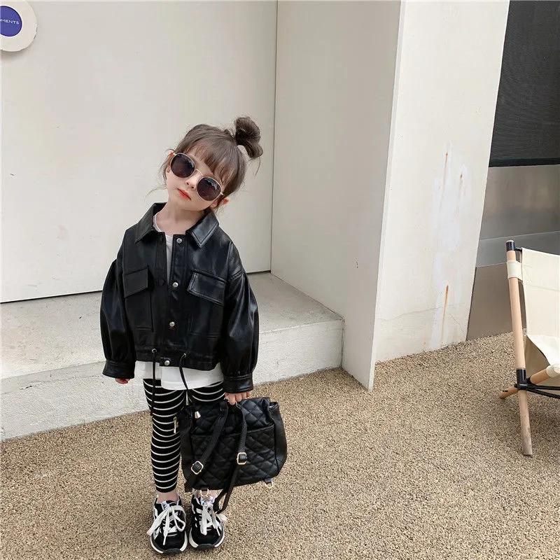 Весна и осень для девочек однотонная куртка из искусственной кожи с лацканами для детей среднего возраста с длинными рукавами, простая милая куртка 90 чёрный