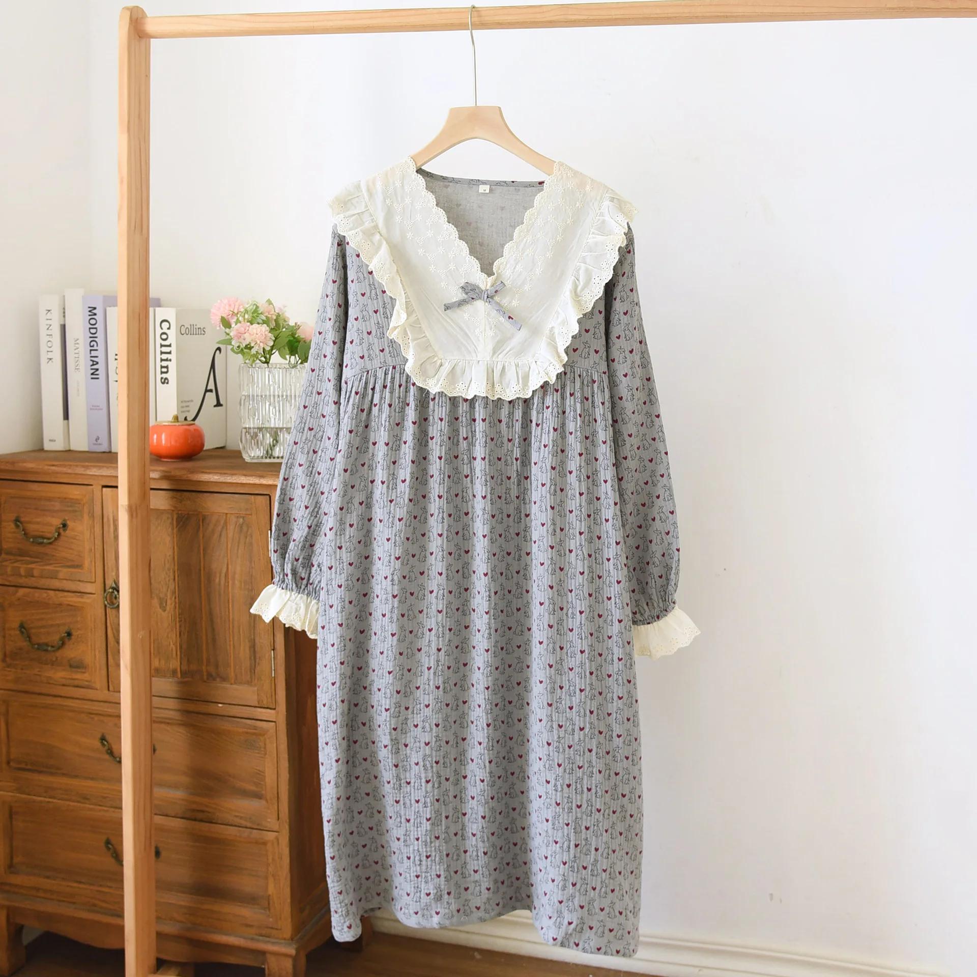 Весна и осень женская хлопковая ночная рубашка с длинными рукавами, простое платье больших размеров с двухслойным марлевым кружевным узором XL серый