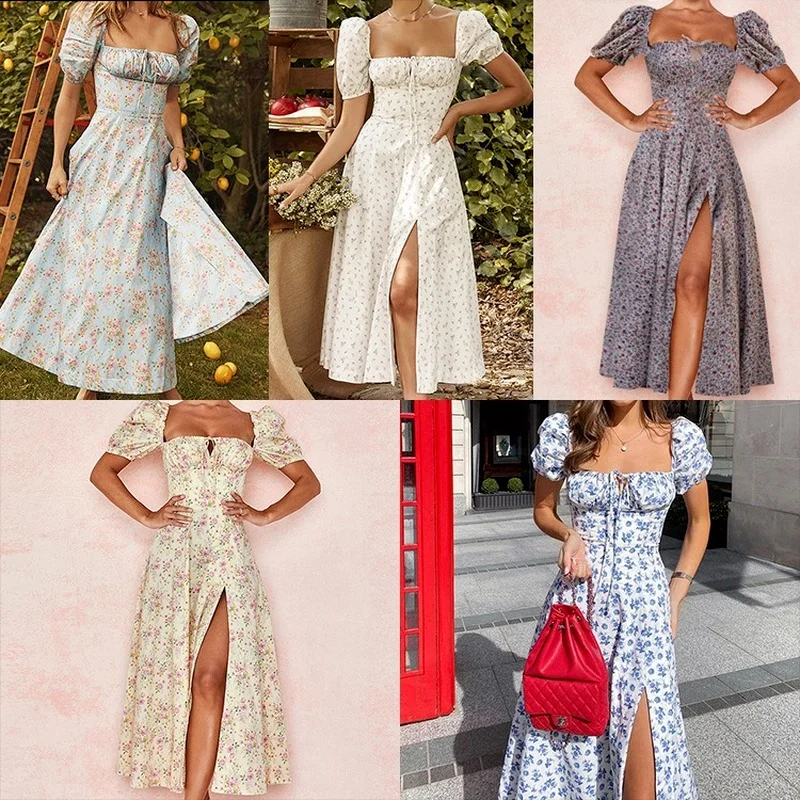 Весна и осень, принт, французский цветочный принт с открытой спиной тонкий ремень Разделение фатиновое платье с квадратным вырезом из хлопч...