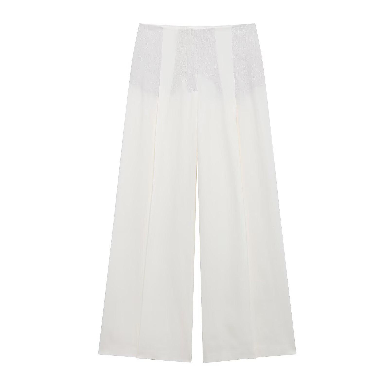 Весна 2025 Женский Свободный Костюм-Жакет на Завязках из Смеси Льна и Комплект Брюк Плиссе с Завышенной Талией S кремовый