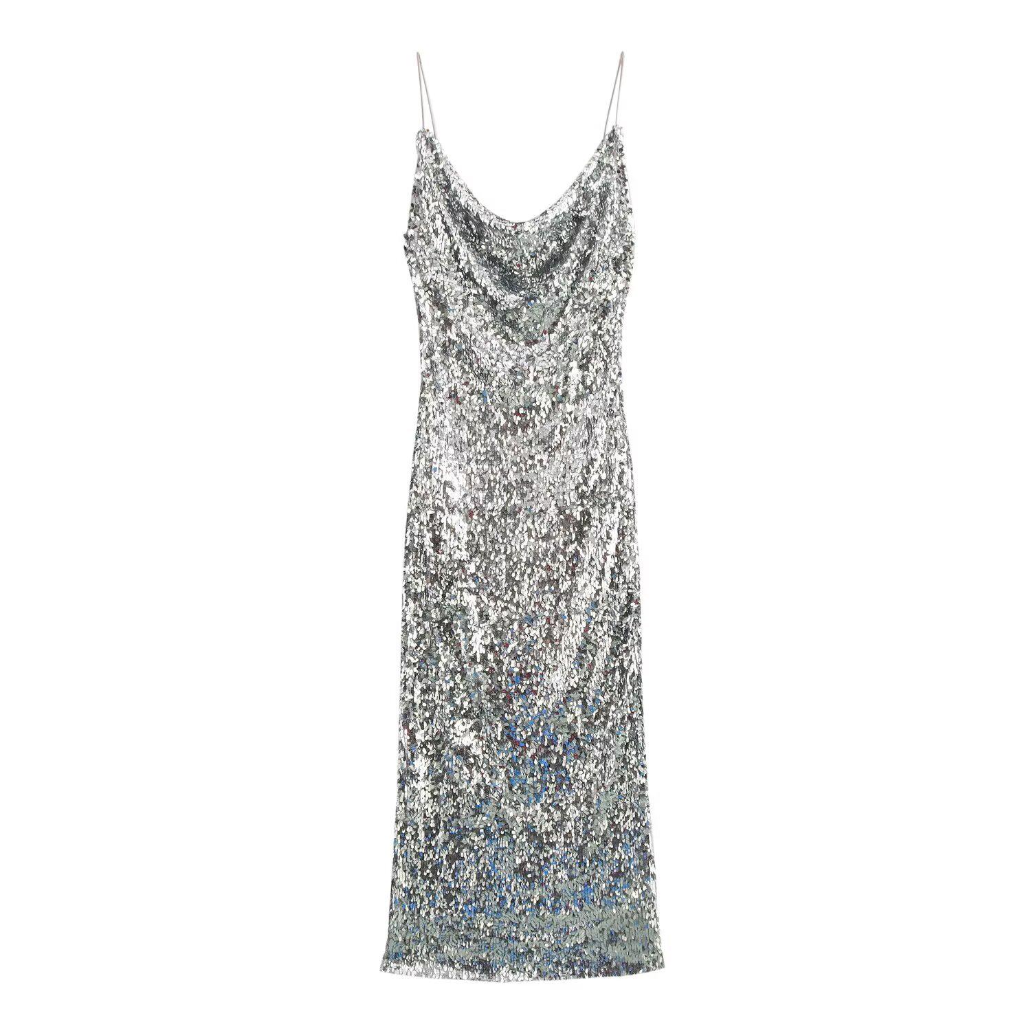 Весна 2025 Женское облегающее миди-платье-комбинация с драпированным воротником и отделкой пайетками Large серебряный