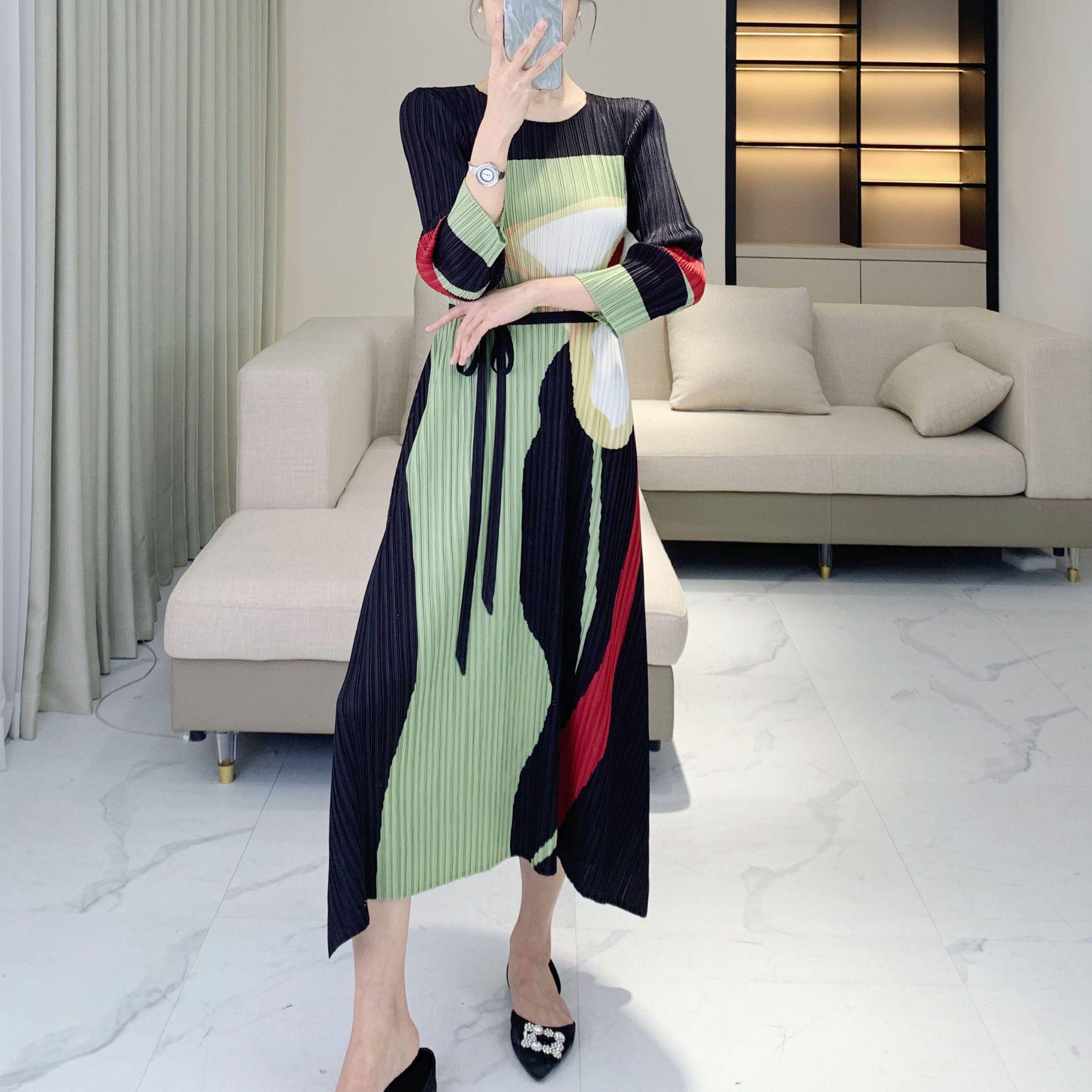 Весна 2025 Модное платье плиссе больших размеров - Омолаживающее с длинным рукавом и круглым вырезом для мам One Size (Fits 40-75 kg) чёрный