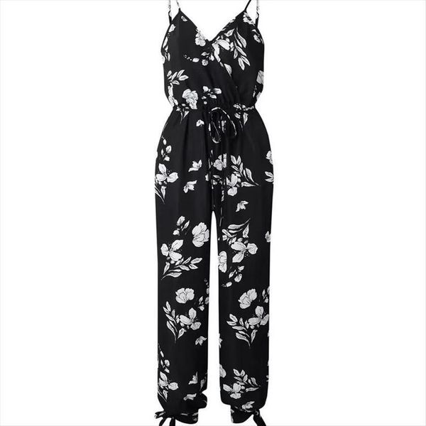 spaghetti strap floral printed womens romper v neck wide legs bodycon boho jumpsuit trousers, Black;white