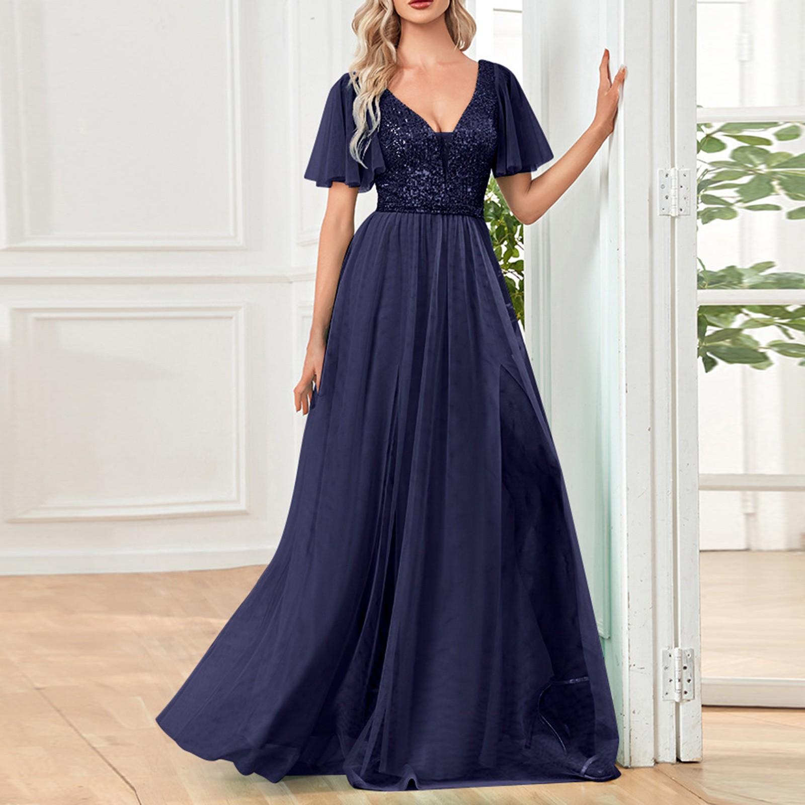 Вечернее платье Банкетное сетчатое длинное платье-халат с V-образным вырезом Сексуальное длинное платье с короткими рукавами XL тёмно-синий