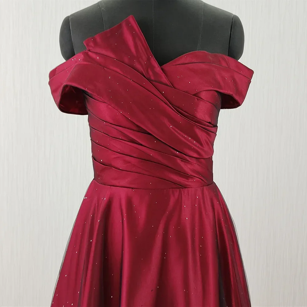 Вечернее платье на заказ с настоящими фотографиями, бордовое атласное платье с открытыми плечами и складками, трапециевидной формы длиной до пола, большие размеры, женские вечерние платья