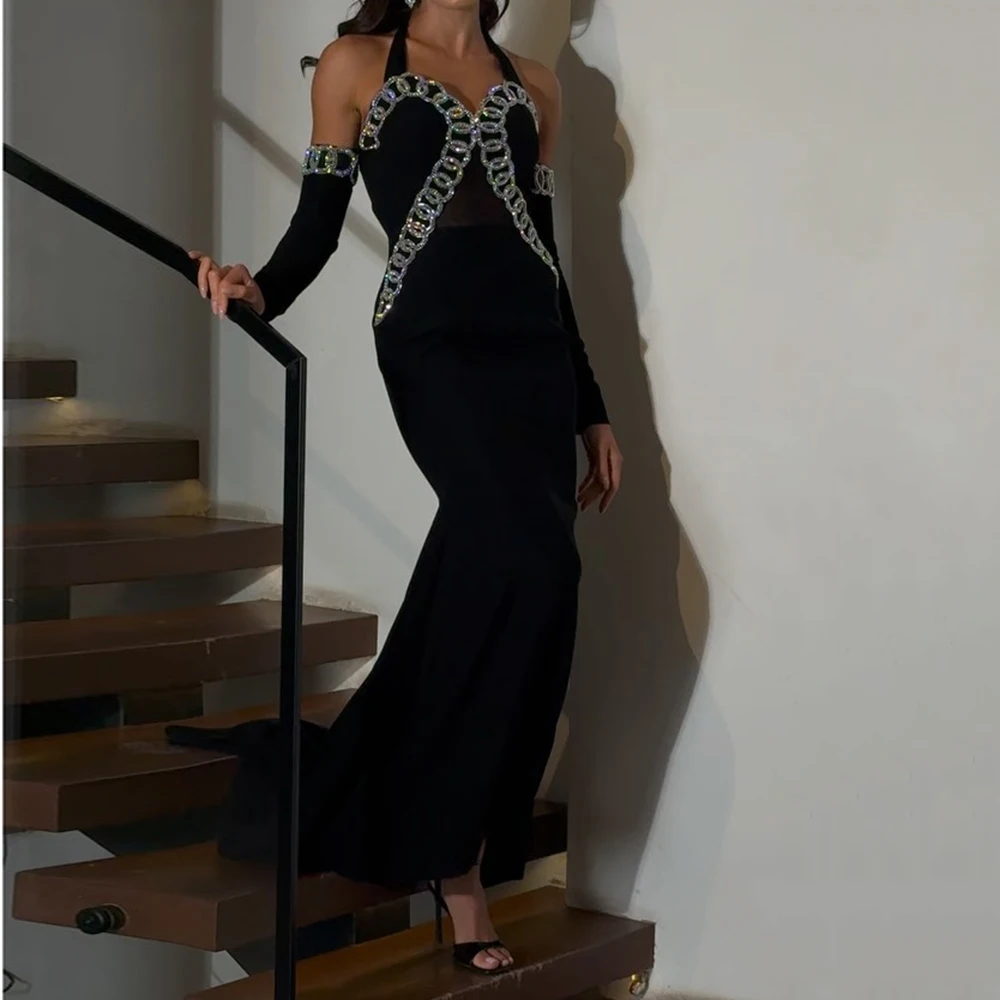 Вечерние платья русалки по индивидуальному заказу, длиной до пола, с v-образным вырезом и длинными рукавами, платье для выпускного вечера, модное простое драпированное вечернее платье с открытой спиной и кристаллами