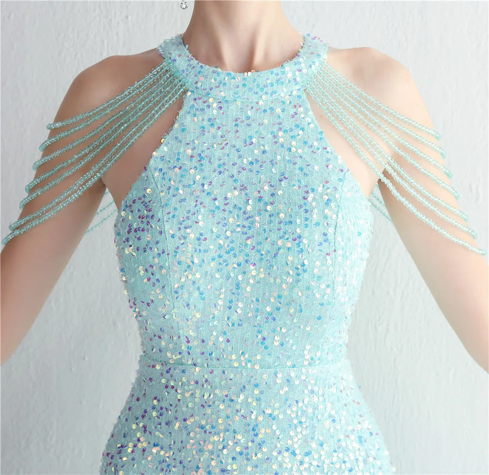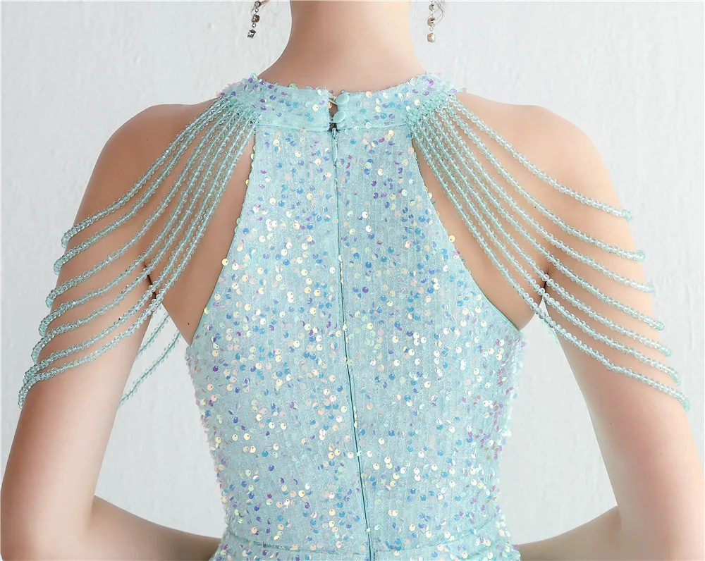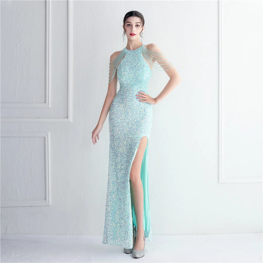Вечерние платья с зелеными блестками, эластичное платье с лямкой на шее и бусинами, на молнии сзади, с юбкой-годе, длиной до пола, женские деловые платья, YE112