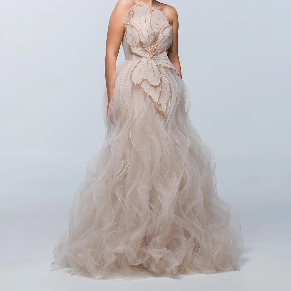 Вечерние платья трапециевидной формы по индивидуальному заказу, длиной до пола, без бретелек, без рукавов, платье для выпускного вечера, модное простое драпированное вечернее платье с цветами и блестками