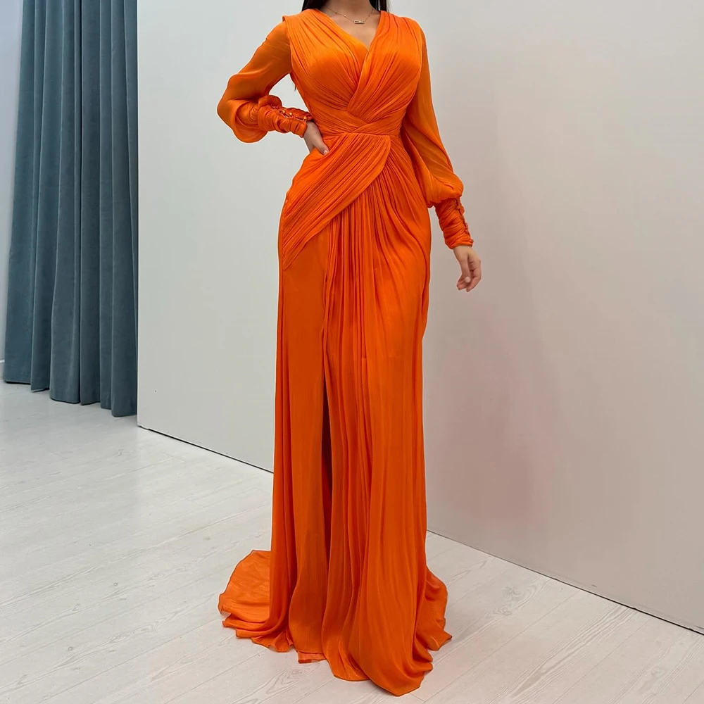 Вечерние платья трапециевидной формы по индивидуальному заказу, длиной до пола, с v-образным вырезом и длинными рукавами, платье для выпускного вечера, модное плиссированное простое драпированное вечернее платье с разрезом по бокам
