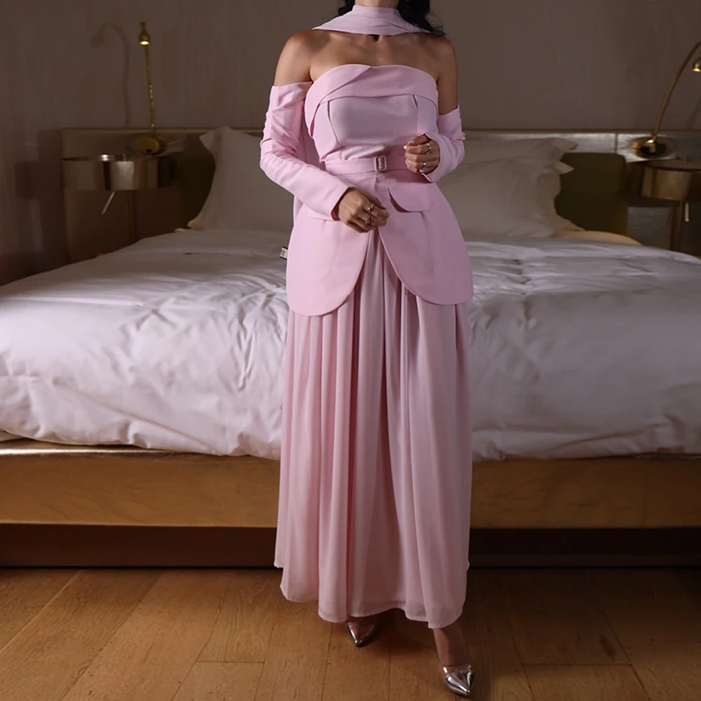 Вечерние платья трапециевидной формы по индивидуальному заказу, длиной до щиколотки, без бретелек, с длинными рукавами, платье для выпускного вечера, модные пояса и карманы, простое драпированное вечернее платье
