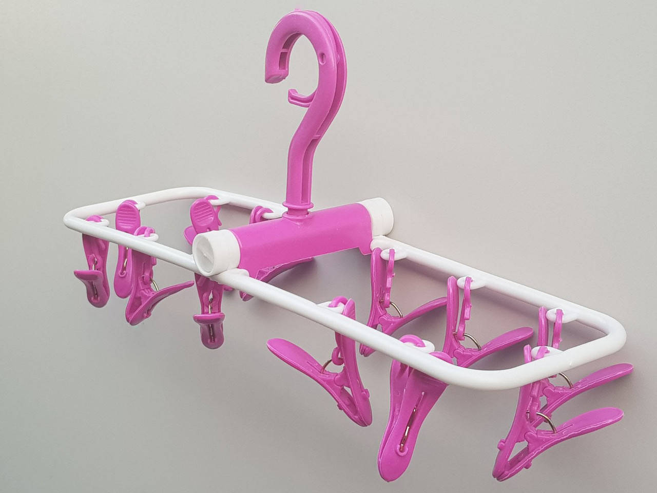 Данная модель изготовлена из высококачественной пластмассы, имеет крутящийся крючок для удобства эксплуатации. На вертушке есть 12 прищепок для фиксации разной мелочевки.