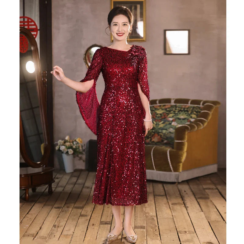 Винно-красные платья для матери жениха с блестками, трапециевидные женские платья средней длины до середины икры для свадебной вечеринки 2024